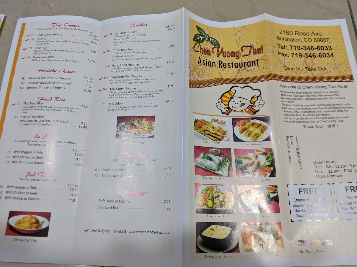 The menu at Chen Vuong Thai offers a straightforward and approachable selection of Thai favorites, perfect for casual meals whether you're grabbing a quick takeout or settling in for a comforting dinner at home. You’ll find a balance of classic curries, such as green curry and panang, alongside popular noodle dishes like shrimp pad thai noodles and Singapore rice noodles. Simple sides like steamed rice and golden tofu complement these well-rounded options.